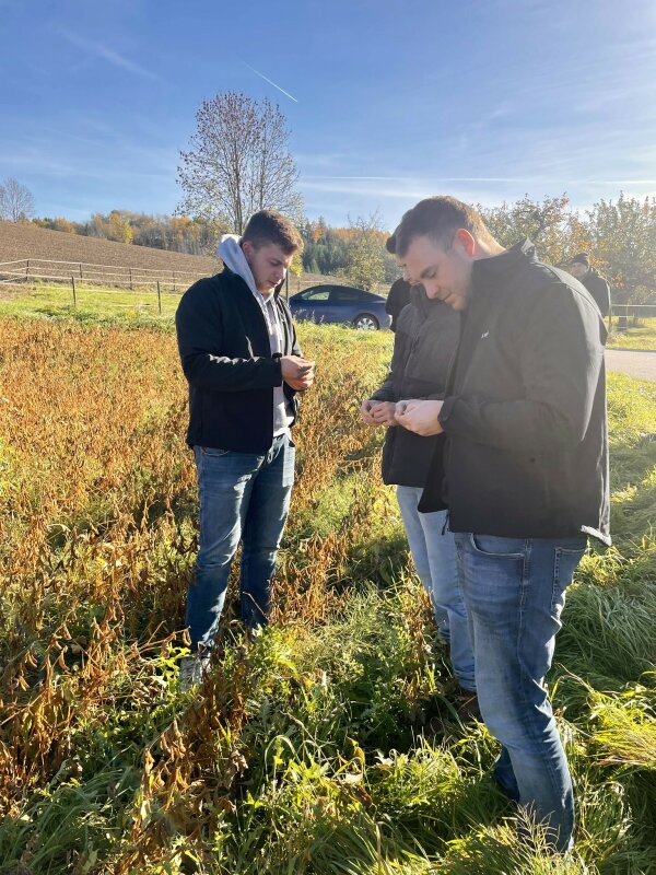 Darüber hinaus stellte ein Landwirt seinen Ackerbau im Strip-Till-Verfahren vor. Er erläuterte, wie das Strip-Till-Verfahren hilft, dien Herausforderungen des Klimawandels zu begegnen. Zudem stellte er auf einer Fläche den Anbau von Sojabohnen als Zweitfrucht vor, der nach der Wintergerstenernte gesät wurde und im Oktober kurz vor der Ernte stand. Die Studierenden erfuhren, wie man durch den Anbau einer Zweitfrucht z.B. die Erosion mindert, die Sommervegetation nutzen kann und die Wirtschaftlichkeit steigern kann.